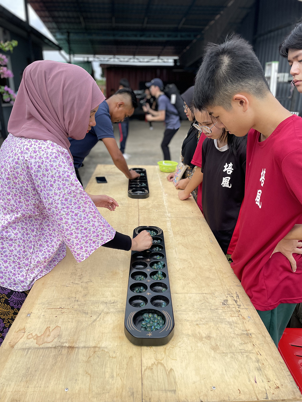 为呼应主办方的分享,Kak Yna一家协同村委会主席 Hj.Saadon bin Hj. Baharom,亦邀请村民一起向培风师生展示传统的马来乡村生活。村民提前细心准备了许多马来乡村的传统工艺品进行展示。傍晚时分,村民陆续前来,婆婆妈妈们自然地聚到现场搭建的矮台子上,剥江鱼、切大葱、编制马来粽,开始忙碌地准备江鱼仔炸团子(cekodok ikan bilis)、摊煎饼(lempeng)等各种传统小吃。年轻的马来孩子则玩起了踢藤球、马来播棋(Congkak)等传统游戏,很快就吸引了现场其他孩子的目光,纷纷主动加入。马来乡村生活之美,师生身历其境,无需一言一语。