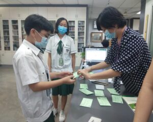馆员交任务卡给欲参加馆内寻宝活动的同学(知知寻宝记)