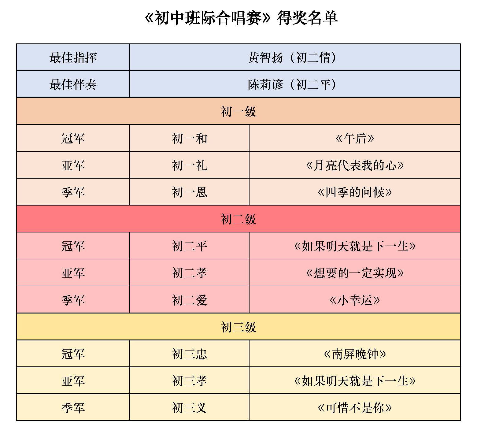 最佳指挥:黄智扬 初二情最佳伴奏:陈莉谚 初二平初一级冠军:初一和《午后》亚军:初一礼《月亮代表我的心》季军:初一恩《四季的问候》初二级冠军:初二平《如果明天就是下一生》亚军:初二孝《想要的一定实现》季军:初二爱《小幸运》初三级冠军:初三忠《南屏晚钟》亚军:初三孝《如果明天就是下一生》季军:初三义《可惜不是你》