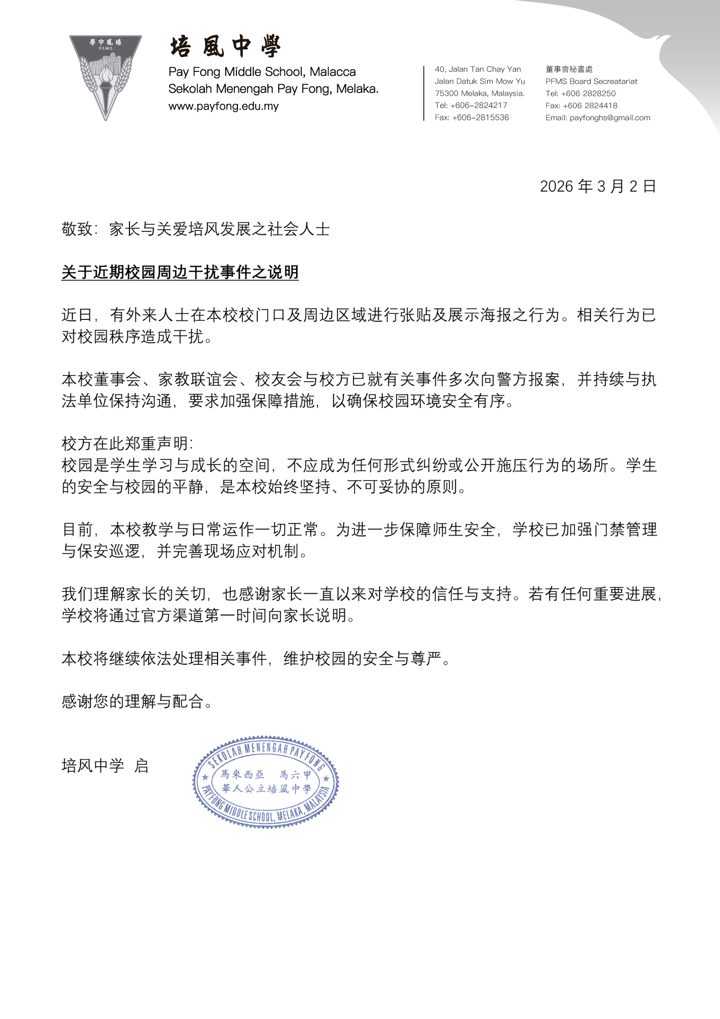 本校董事会、家教联谊会、校友会与校方已就有关事件多次向警方报案,并持续与执法单位保持沟通,要求加强保障措施,以确保校园环境安全有序。